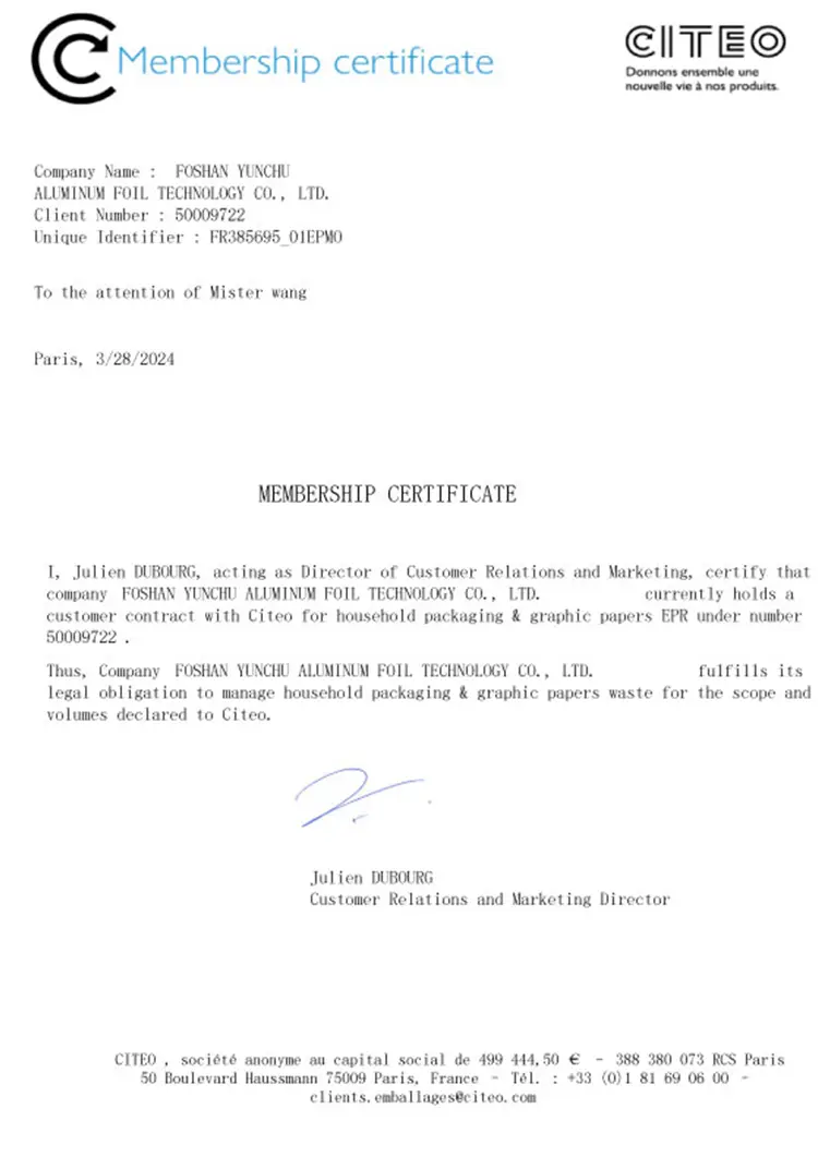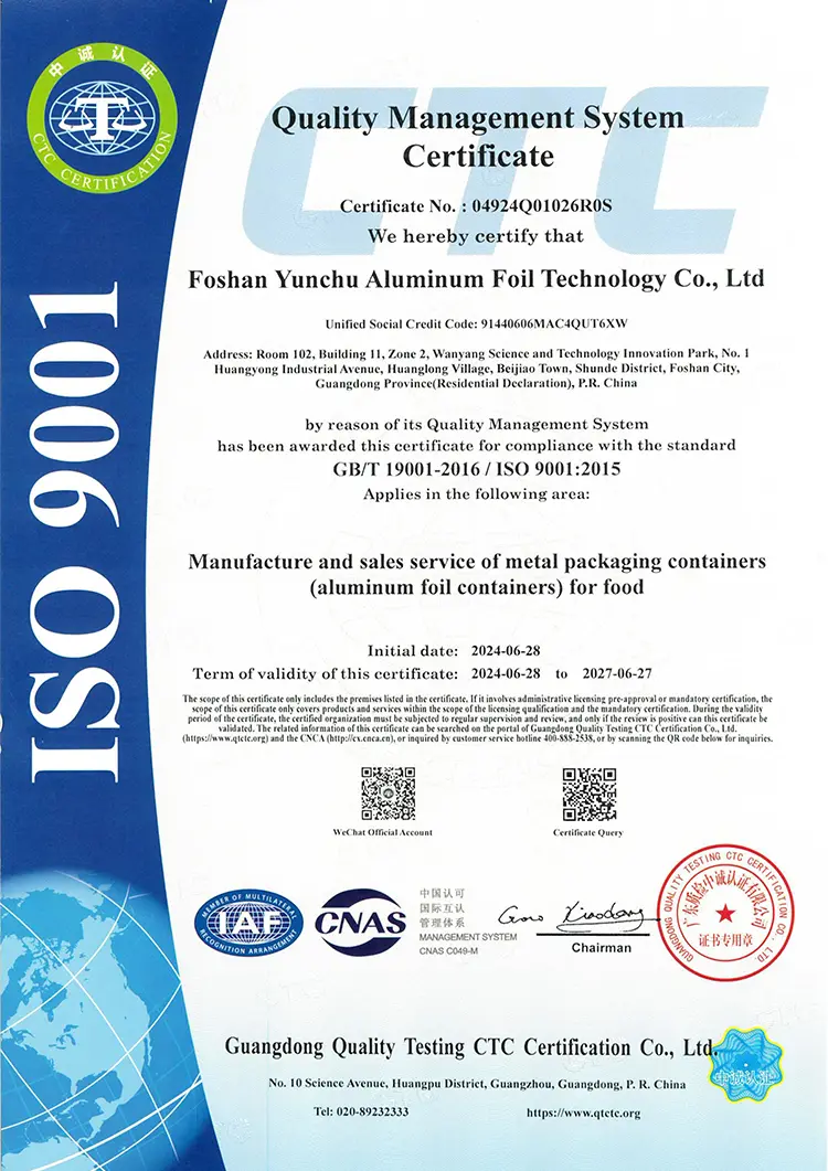 Foshan Yunchu Aluminium Foil Technology Co.、Ltd。は、国際的な品質基準を厳守しています。 当社の製品は取得しました: