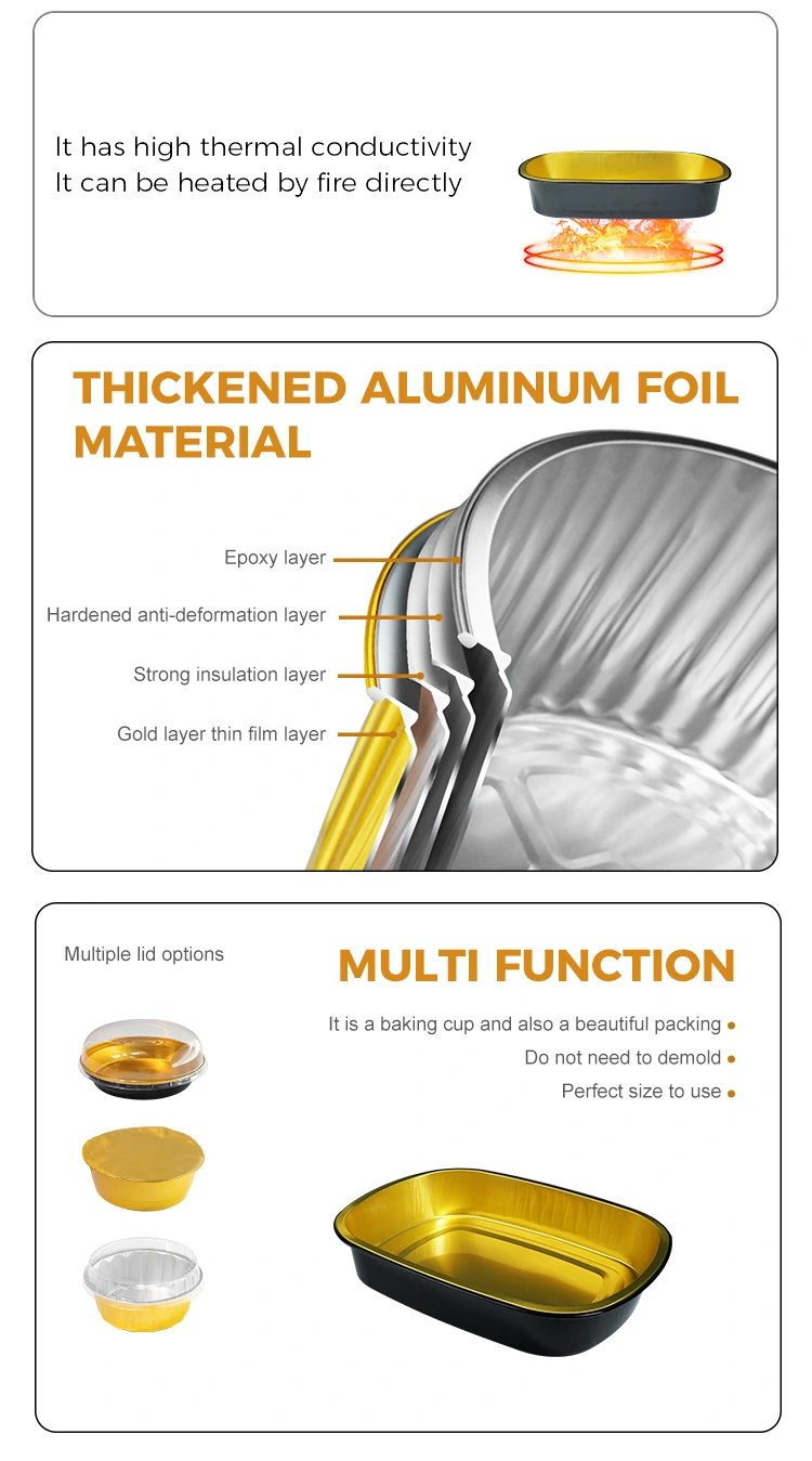 Yunchu Aluminium Supplier使い捨てブラックゴールドケータリング長方形のアルミホイルコンテナは、特にベーキング、ケータリングチェーン、セルフサービスチェーン、その他のシナリオに適した大容量のケータリングやテイクアウト産業に適しています。配置するには、優れたシーリング性能、高温抵抗、オイル、リーク予防機能を備えた、アルミホイルシーリング蓋と完全に透明な蓋で使用できます。食品包装、暖房、冷蔵、持ち帰りなどのさまざまなシナリオで広く使用されています。表面は、フラットで滑らかな外観を備えた軽い壁のデザインを採用しています。これは、熱で密閉されたフィルムの自動シーリングに便利で、パッケージング効率が向上します。