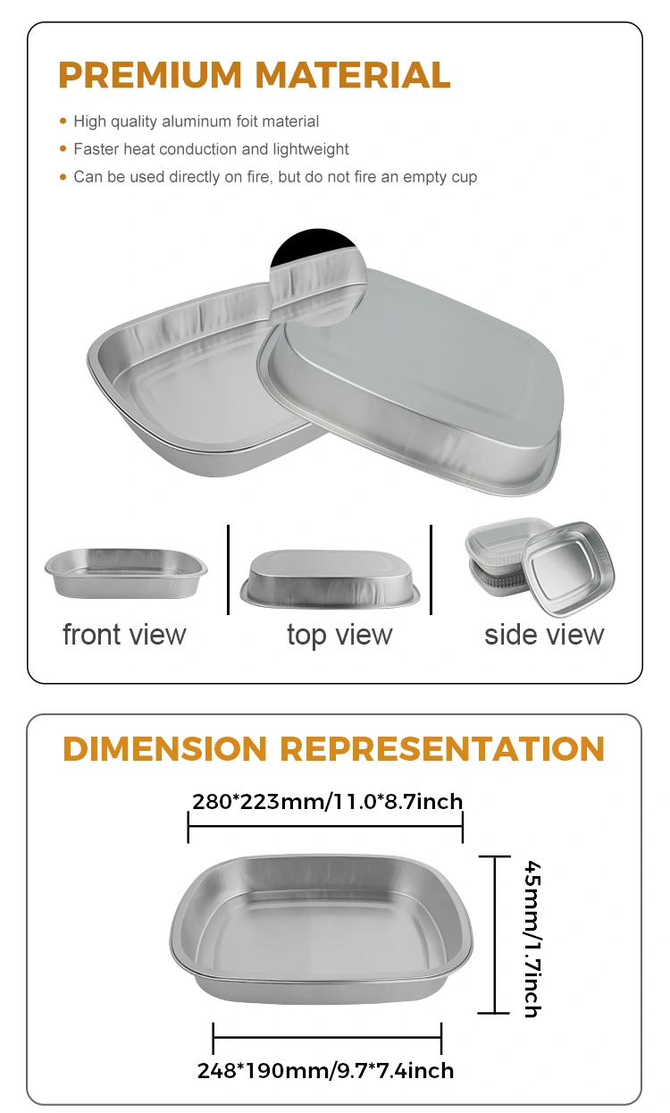 4. テイクアウェイスクエアシルバーアルミホイルフードパンは、シンプルですっきりとしたラインを採用し、モダンなシルバーの光沢が引き立てられています。食品の視覚的な魅力と全体的な品質を向上させ、ブランドのプロフェッショナルで高級なイメージを強化するのに役立ちます。