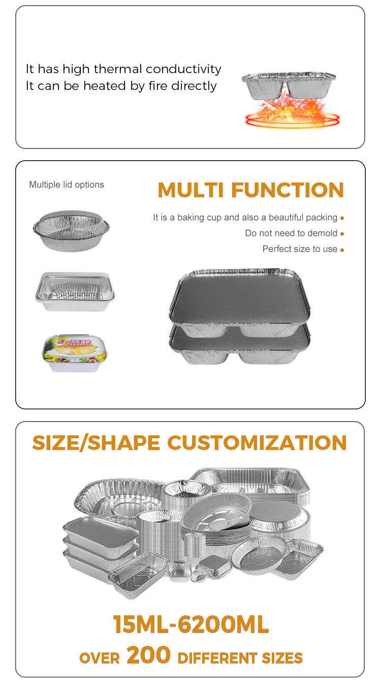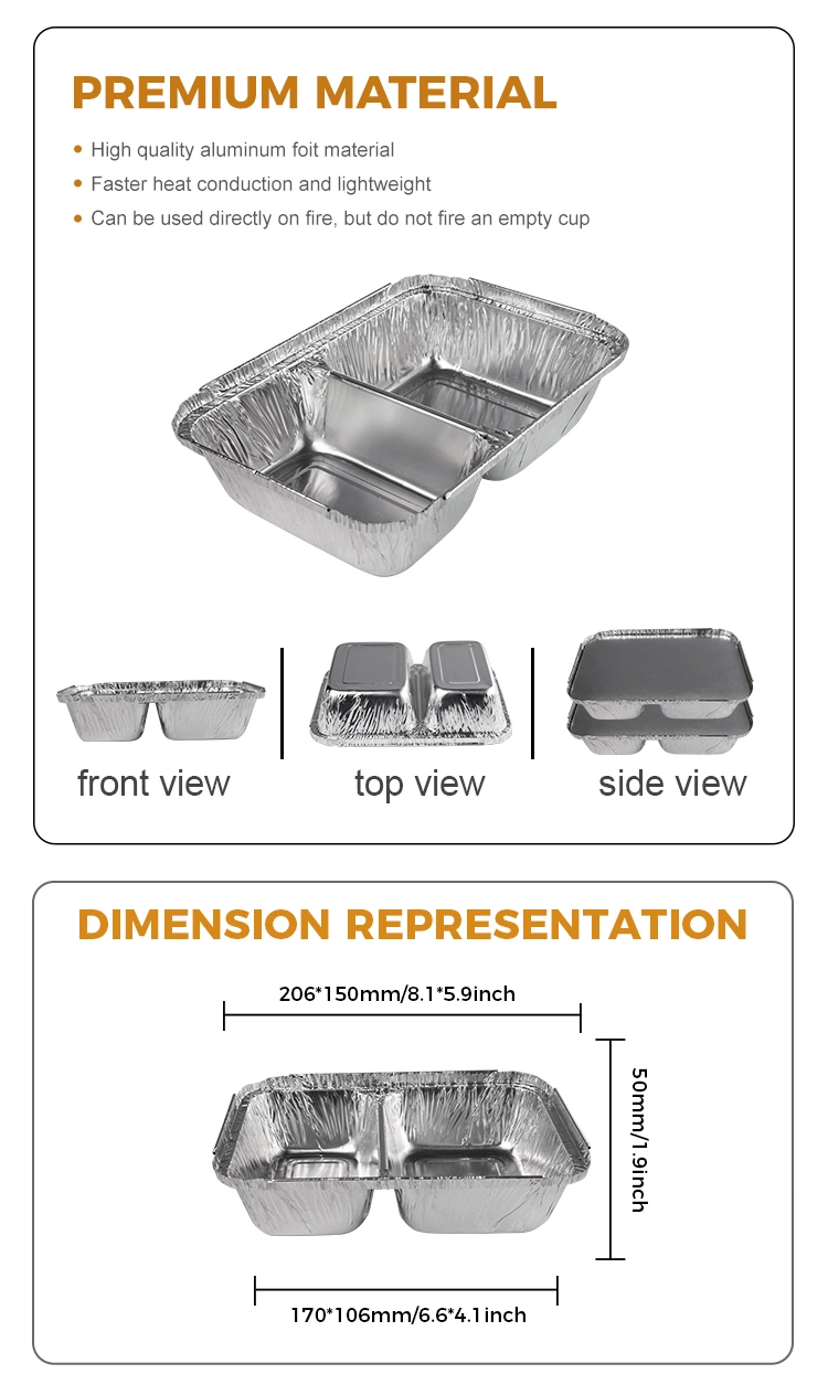 使い捨てコンパートメントの表面ファーストフードシルバーアルミホイル容器には特定の光沢があり、シンプルできれいな視覚体験を提供します。同時に、通常の形状を備えており、スタッキングや配置など、さまざまなパッケージングや輸送の要件に適応できます。