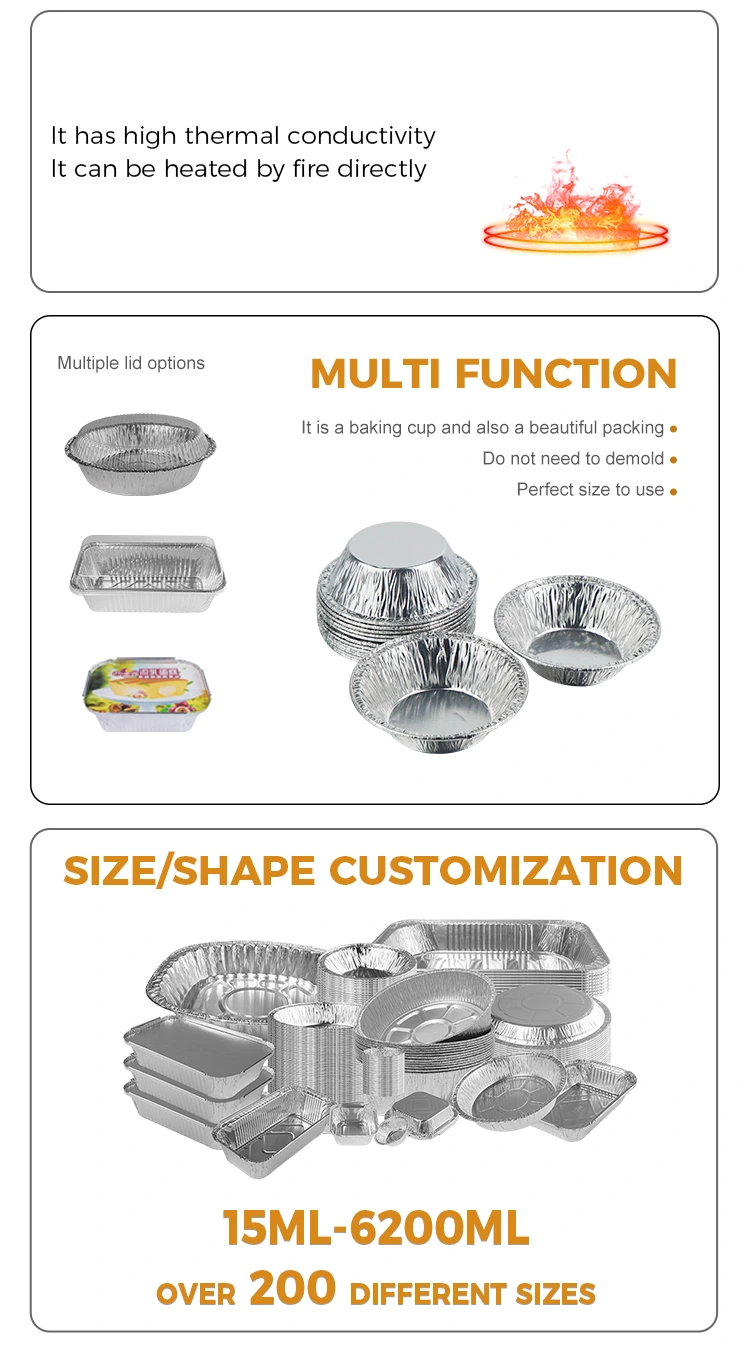 商業ビジネスシナリオ: 西洋のベーカリー、デザートショップ、ファストフードチェーンストアでは、雲中アルミホイルエッグタルトトレイを使用しています。これは、製パンと販売を統合するために直接使用できるため、包装変換ステップの必要性がなくなり、業務効率が向上します。幅広いサイズと色が用意されており、絶妙なデザートと組み合わせることで、製品の視覚的魅力を高め、特別なヒット商品の作成に役立ちます。蓋付きのデザインは、保管と配布を容易にし、デザートのこぼれを防ぎ、味を保証するテイクアウトビジネスに適しています。品質。