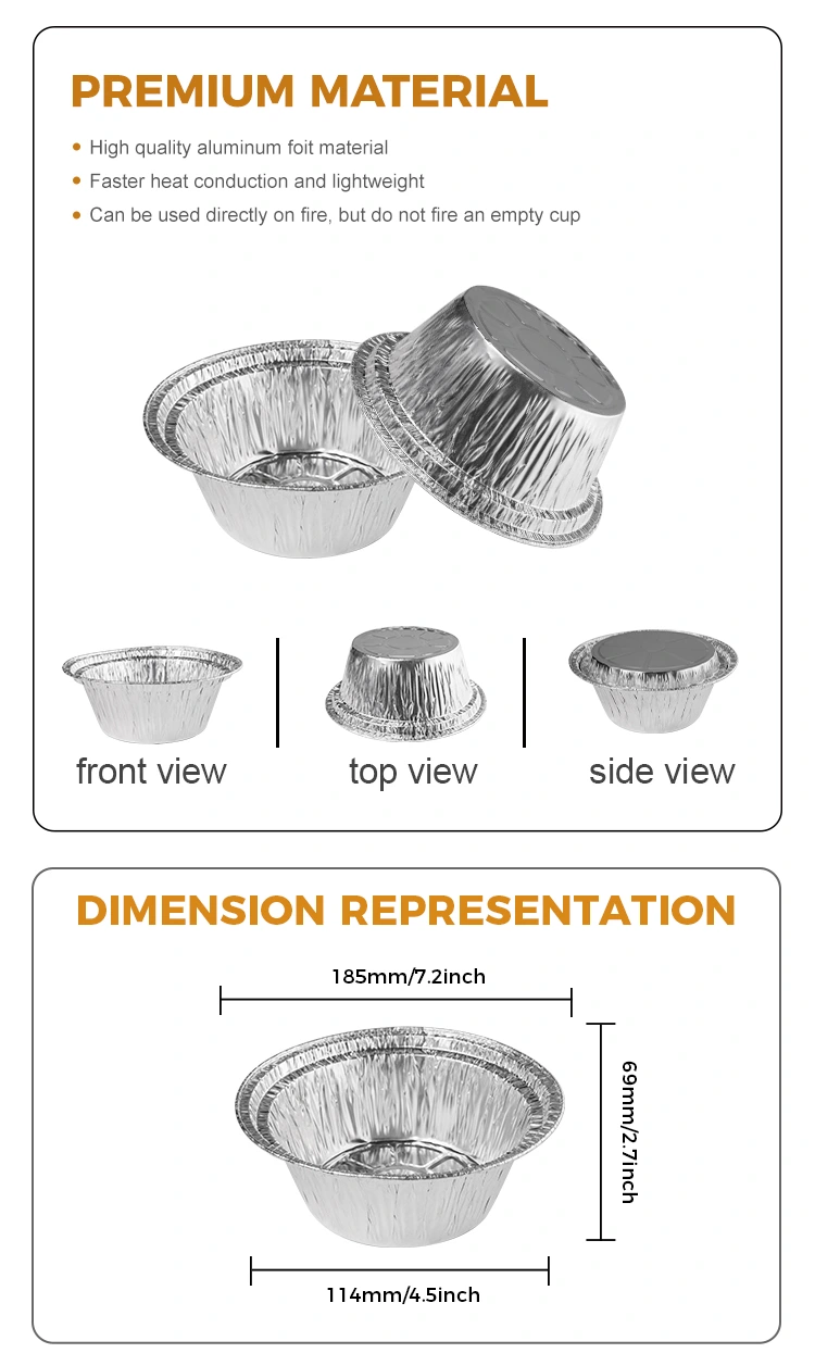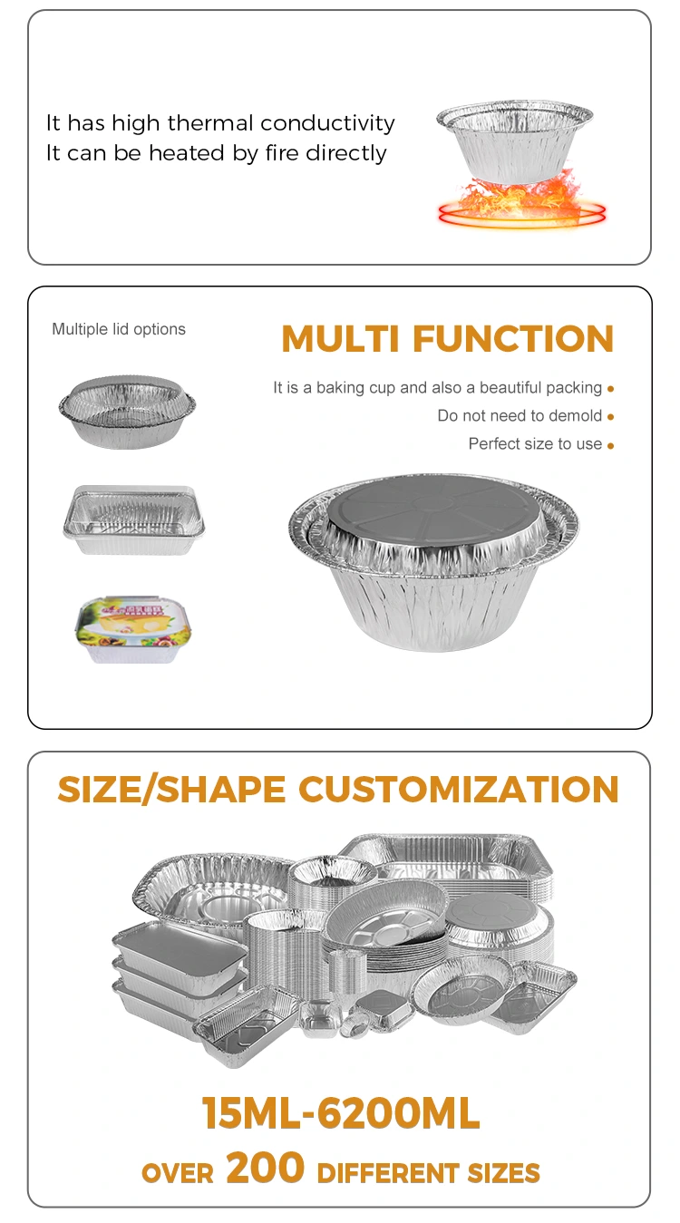 Yunchu Aluminum Supplier Round Small Package Sill Silver Aluminium Aluminum Food containerは、食品グレードのアルミホイル材料で作られています。会社の食品認証の検査後、材料は油を加えて焦げつけられ、ポットを洗う問題を効果的に解くことができます。オーブン全体のオーブンは、開いた炎で使用できます。アルミホイルボックスの肥厚した材料は、変形が容易ではなく、使用されるアルミニウムフォイルボックス製品はプラスチックであり、使用する際に使用する方が便利です。食品は、生産条件を満たすためにさまざまな方法で作ることができます。さまざまな用途のニーズを満たすために選択できるさまざまなスタイル、2種類の蓋から選択できます。透明なアルミホイルの蓋、プラスチック材料、透明な蓋は、ランチボックスよりも1〜2 cm高く曇らない(アルミニウムフォイルカバー、銀アルミニウムフィルムカバー、ティンオイルストレジーは、パックをブロックすることができます。
