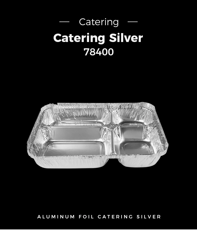 Yunchu Aluminium foil Supply Factoryは、モデル番号78400の新しい使い捨てマルチコンパートメントファーストフードシルバーアルミホイルコンテナを発売しました。コンテナは、244 mm(9.6インチ)と195 mm(7.6インチ)および217 mm(8.5インチ)および168 mm(6.6インチ)のみの高さ168 mm(8.5インチ)の上部直径の高さで巧妙に設計されています。約1020 mL(36.0オンス)の容量で、4つのコンパートメントにさまざまな食品を保持するのに便利で実用的です。