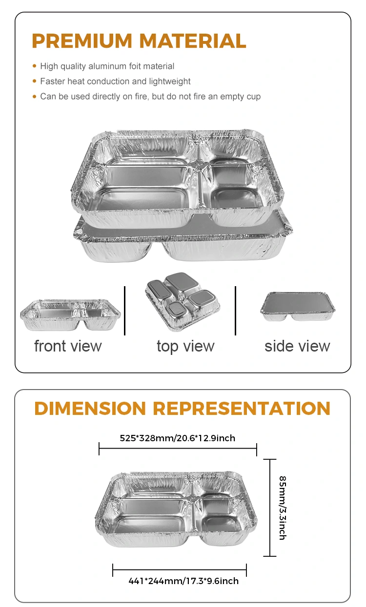 このフォイルランチボックスには、滑らかな表面があり、清潔できれいな雰囲気を与えます。その通常の形状により、スタッキングや配置など、さまざまなパッケージングや輸送の要件に簡単に適応できます。