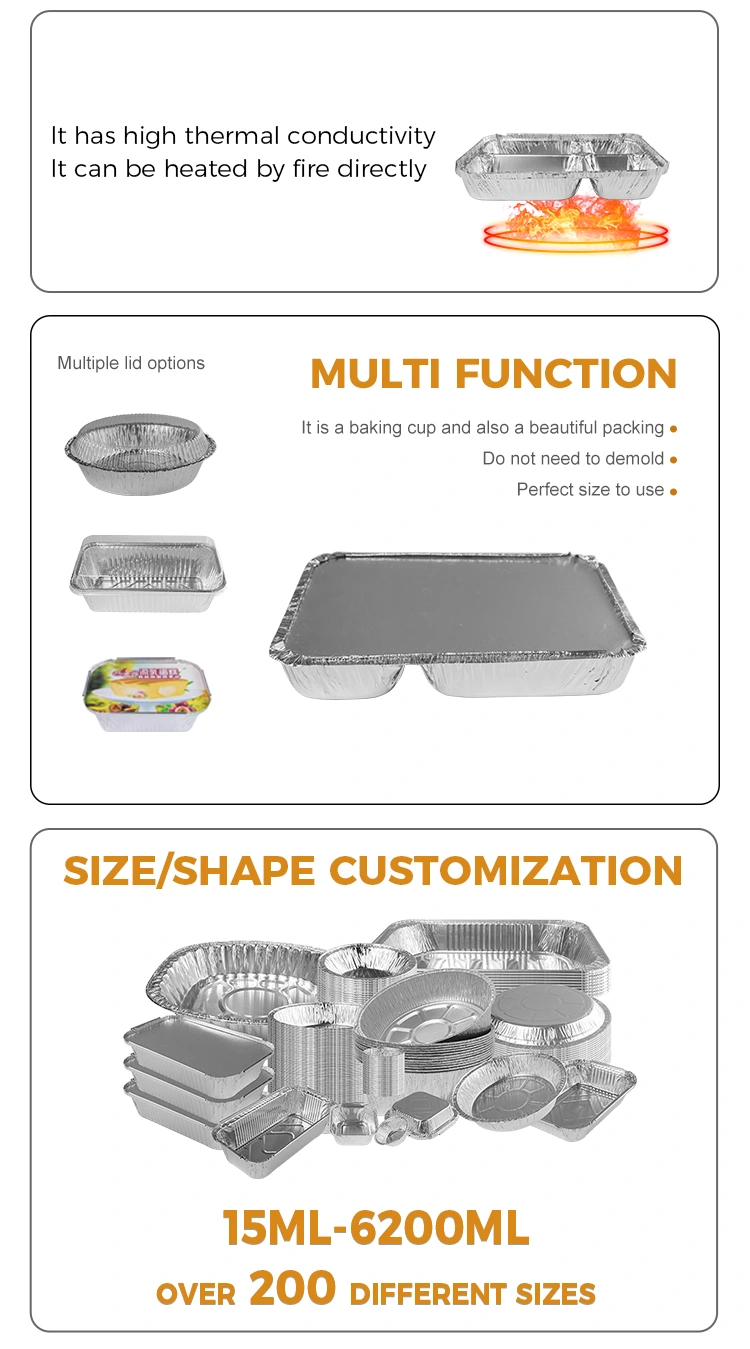 このアルミホイルランチボックスには、熱断熱特性があるだけでなく、アルミホイルの蓋と組み合わせて、製品の実用性をさらに高めることもできます。さらに、ブランドイメージを強化し、カスタマーメモリポイントを改善するためのカスタマイズされたロゴサービスも提供しています。