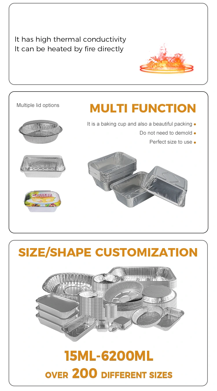 Yunchu アルミホイルメーカーの使い捨て長方形ベーキングエアフライヤーシルバーアルミホイルコンテナは、キッチン、ベーキング、便利なケータリングのニーズ向けに設計されています。食品グレードのアルミ箔を原材料として使用し、安全性、実用性、環境保護を考慮して精密にプレス加工されています。焼成後の面倒な洗浄、容器の適応性の悪さ、食材の臭いの問題を完全に解決し、毎日の食事を簡単、安心、清潔、効率的にします。使い捨ての長方形のベーキングエアフライヤー銀アルミホイル容器は、一定の熱伝導率を有し、熱を均一かつ迅速に伝導し、エアフライヤーの高温環境に正確に適応できます。 -20℃から250℃までの極端な温度に耐えることができます。冷蔵庫から取り出した後、容器をそのままそのままフライヤーに入れて加熱できます。厚みのあるアルミホイル素材は非常に丈夫で、変形したり壊れたりしにくいです。ノンフライヤーの内釜やオーブンの汚れを防ぎ、面倒な掃除の手間が省けます。使い捨て製品なので、使用後は洗浄せずにそのまま捨てることができ、完全に手を解放します。同時に、アルミ箔素材は100%リサイクル可能です。