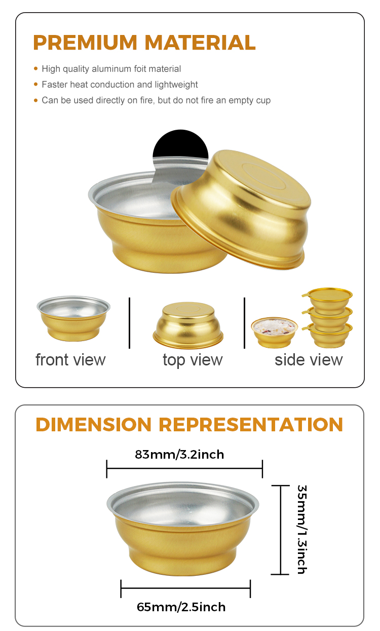 Yunchu アルミホイルメーカー 使い捨てラウンドテイクアウトボックス 小さなゴールデンボウル アルミホイルコンテナ YC120 の上部直径は 83 mm (3.2 インチ)、底部直径は 65 mm (2.5 インチ)、高さは 35 mm (1.3 インチ)、容量は約 120 ml (4.2 オンス) です。カラー、太さ、エンボスロゴなどのカスタマイズに対応。