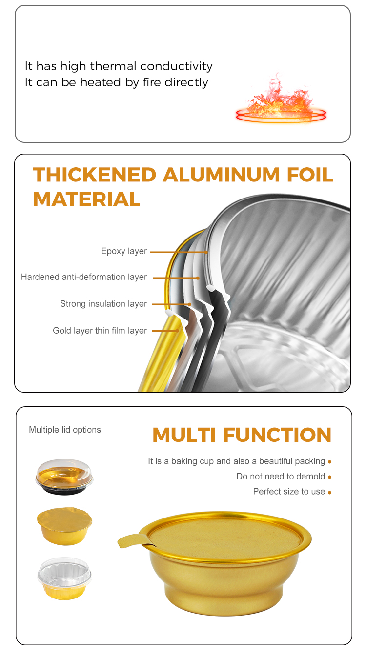 雲中アルミホイルメーカーの使い捨てラウンドテイクアウトボックス小さな金色のボウルアルミホイル容器は、食品グレードのアルミホイル素材から作られ、清潔さと衛生を確保するために厳格な生産段階で加工されており、お客様に安心してご使用いただけます。使い捨て丸型テイクアウトボックス 小金ボウル アルミホイル容器は、高温蒸しに強く、圧縮にも強いだけでなく、空気漏れや膨らみなどの問題も防ぎます。環境性能がある程度保証されており、錆びにくく、開口部が広い設計が特徴です。また、イージープルリッドやティアオフリッドなどのさまざまなアルミホイルリッドを装備することもできるため、食品包装工場で食品を簡単に梱包できます。また、食品に直接触れる内側には保護コーティングが施されており、さまざまな食材の保存に適しています。