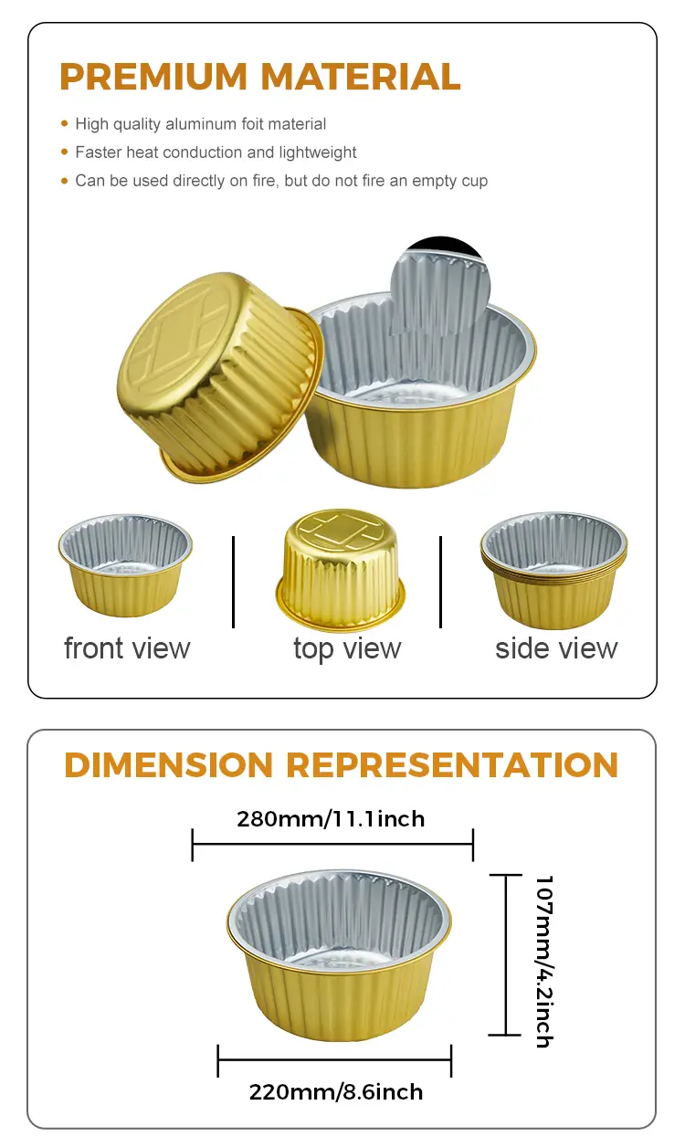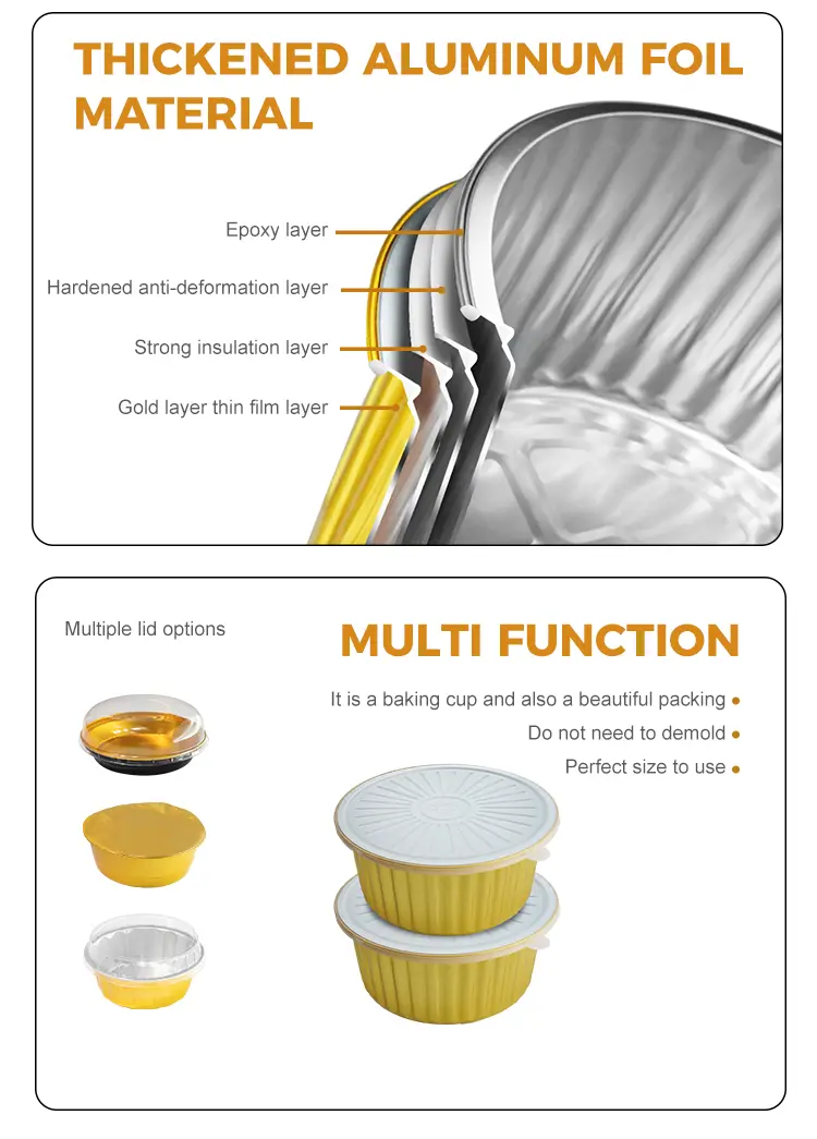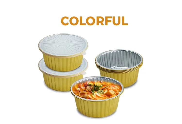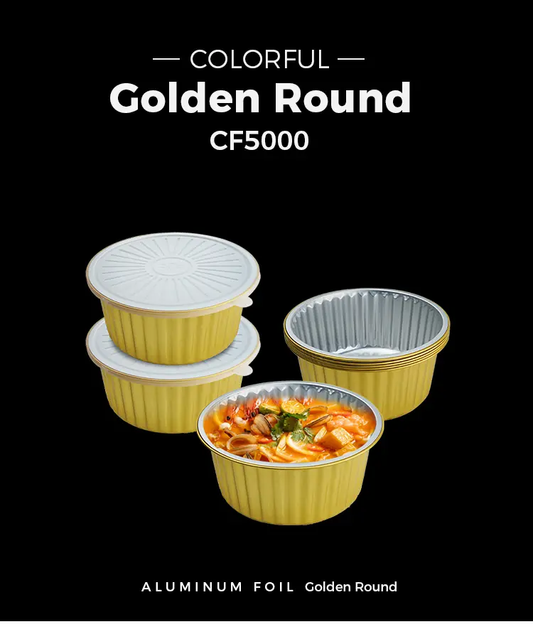 • 使い捨ての密封可能なゴールデンラウンドアルミホイル容器使い捨ての密封可能なゴールデンラウンドアルミホイル容器