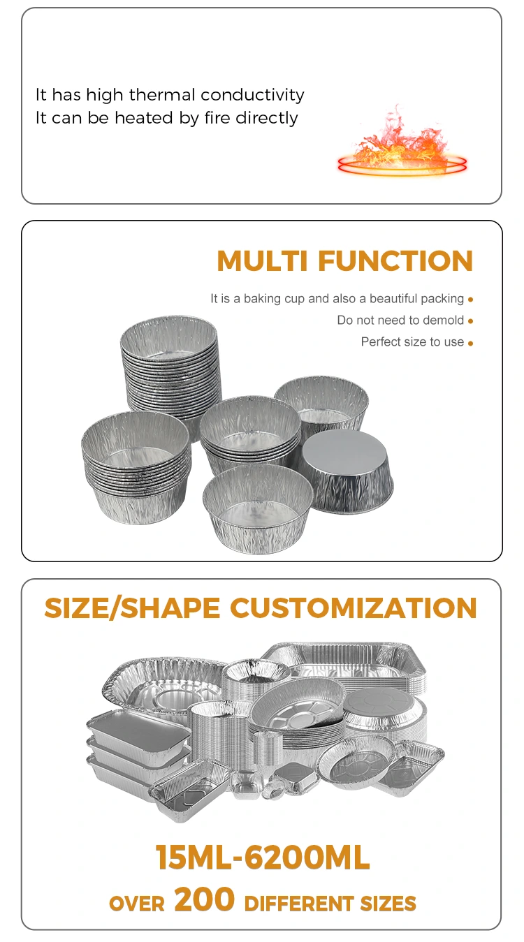 雲中アルミホイルサプライヤーの使い捨て銀丸浸漬エアフライヤー銀アルミホイル容器は、食品グレードの厚手のアルミホイルで作られています。安全で、臭いがなく、有害な沈殿物もありません。あらゆる種類の浸漬材料に直接接触できます。この小さなアルミホイル容器は積み重ねてスペースを節約でき、変形せず、漏れません。銀色のアルミ箔は均一な質感と優れた熱伝導性を持っています。レストラン、カフェ、家族の集まりなどで使用できます。エアフライヤーなどで軽食を入れて使用します。濃厚なソースや油っぽいつゆが入っていても漏れません。テーブルトップやキッチン用品を清潔に保ちます。箔の表現がシンプルで美しく、様々なシーンで活躍します。シルバーの外観は様々なディナープレートにマッチします。