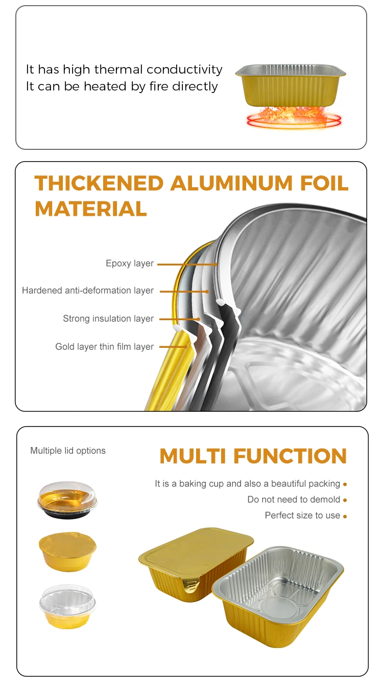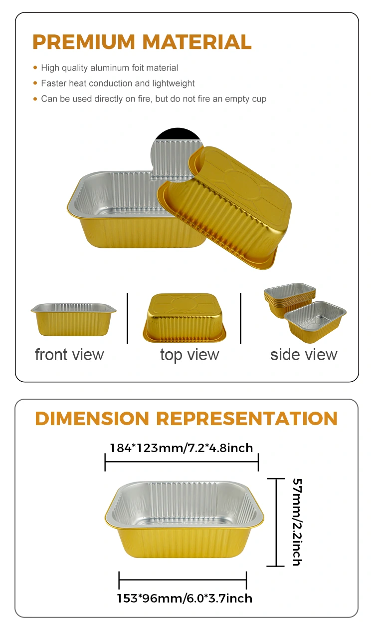 Yunchu Aluminum Aluminium Foil使い捨て四角いシールグラタンアルミホイル容器、焼きたてのパスタやその他の料理の単一サーミングに適したパッケージ、パッケージングランチボックスケータリング、テイクアウト、事前に作られた料理はパッケージ製品を選択できます。ヒートシーリングフィルムを使用すると、効率的なシーリングを実現し、自動シーリング装置に適したスープの漏れを効果的に防ぐことができます。容器の表面は滑らかで平らで、ラベルを付けるのが簡単で、美しくて寛大で、ブランドイメージを強化するのに役立ちます。高温および低温に耐性があり、-20°C〜250°Cの温度範囲で使用でき、冷蔵、ベーキング、蒸しなどのさまざまな加熱方法をサポートします。アルミホイル材料は、100%リサイクル可能で持続可能です。