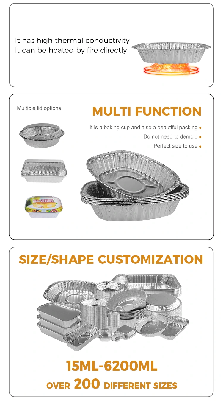 この製品は使い捨て製品であり、清掃する必要はありません。これにより、人件費が節約されます。それは、PET完全に透明なアルミホイル蓋と組み合わせることができます。これは、ほこりや液体の漏れを効果的に防止します。製品の耐久性と安全性は、補強材の設計と、底部の通常の凹面と凸状の形状によって強化されます。ポータブル設計により、高温および低温に耐性があり、-20°Cから250°Cの温度範囲で使用できるようになり、油と水を使用でき、製品の熱保持と輸送の緊張を高めます。