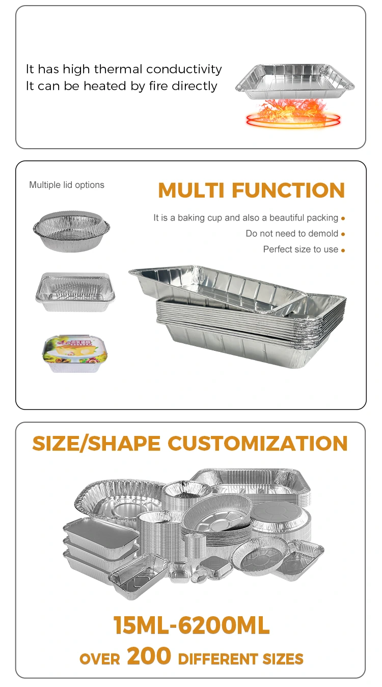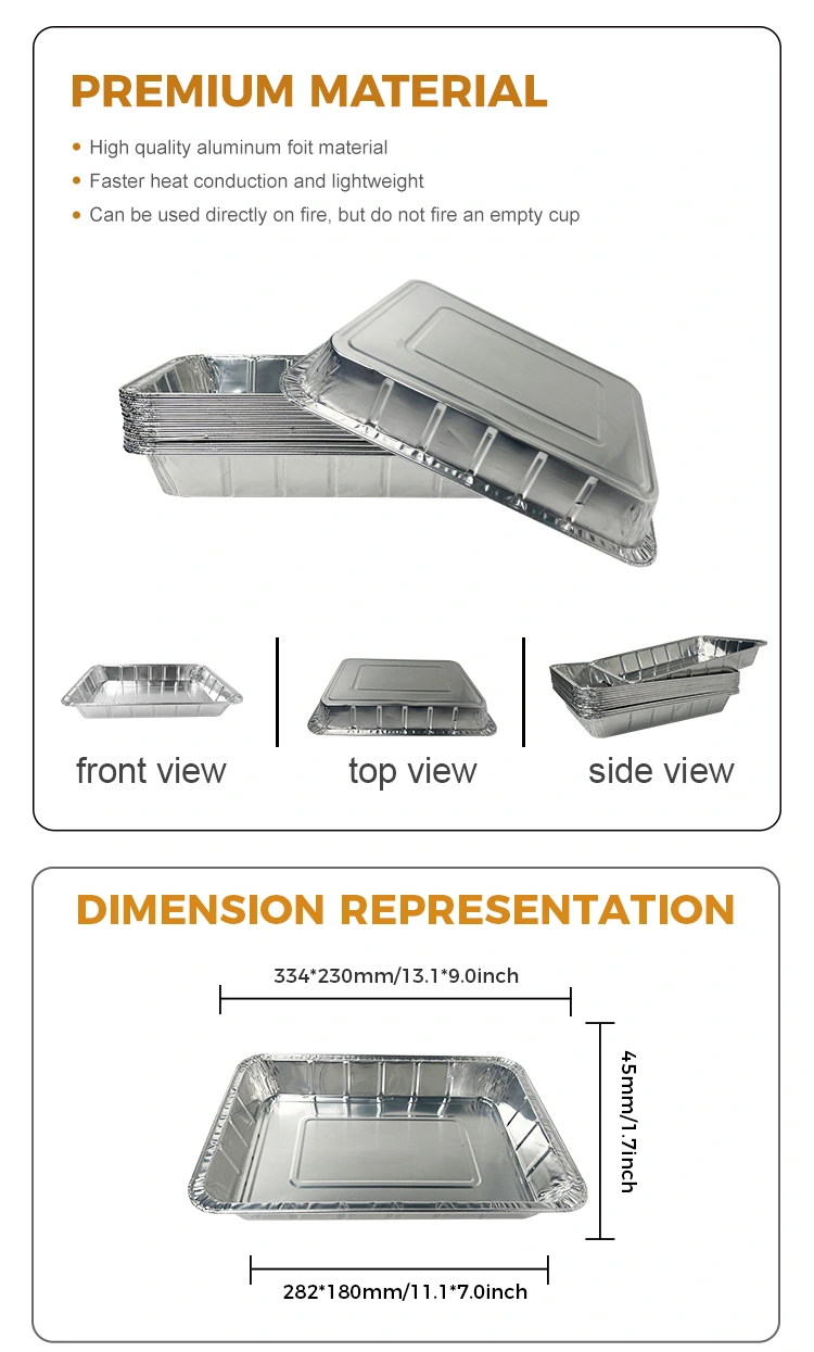 Yunchu Aluminium Supplierの大型グリルフィッシュテイクアウトシルバーアルミホイルコンテナは、エアフライヤー、バーベキューグリル、ロティサリーオーブン、シーフード製造などのさまざまな機会に適したさまざまな調理ニーズを満たしています。このアルミホイル容器は、食物がこぼれたり鍋の壁に固執するのを効果的に防ぐために、上昇したエッジで特別に設計されており、複数の層でパンライナーを保護します。これは実用的で心配です。それは食品グレードの8011-0材料で作られており、耐熱温度は最大520°Cで、焦げたり壊れたりしていません。アルミホイルボックスは全体として厚くなっているため、使用中の変形を心配することなく、料理後に簡単に拾うことができます。裾上げのデザインにより、快適に保持し、エッジが丸くなっているため、指を掻くことを心配する必要はありません。滑らかなエッジは、ペットの完全に透明な蓋とアルミホイル箔の蓋によって補完され、さまざまな調理方法により適しています。