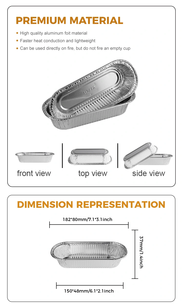 Yunchu Aluminium Supplier Oval Air Fryer Baking Silver Aluminium Foil Containerは、蒸し、沸騰、ベーキング、ベーキングなどの目的に使用できる容器の一種であり、ソース、ソース、小さな調味料、ベーキングサンプルサンプルに使用できます。 8011-0タイプのアルミニウム箔材料、引張抵抗、耐食性は良好な伸長、肥厚したアルミニウム箔材料、自由に壊れるのは容易ではなく、ヘミング、フロントおよびリアの半円の設計は手を傷つけず、統合された成形、壁の表面は鏡と同じくらい滑らかで、さまざまなシナリオで使用するのに適しています。