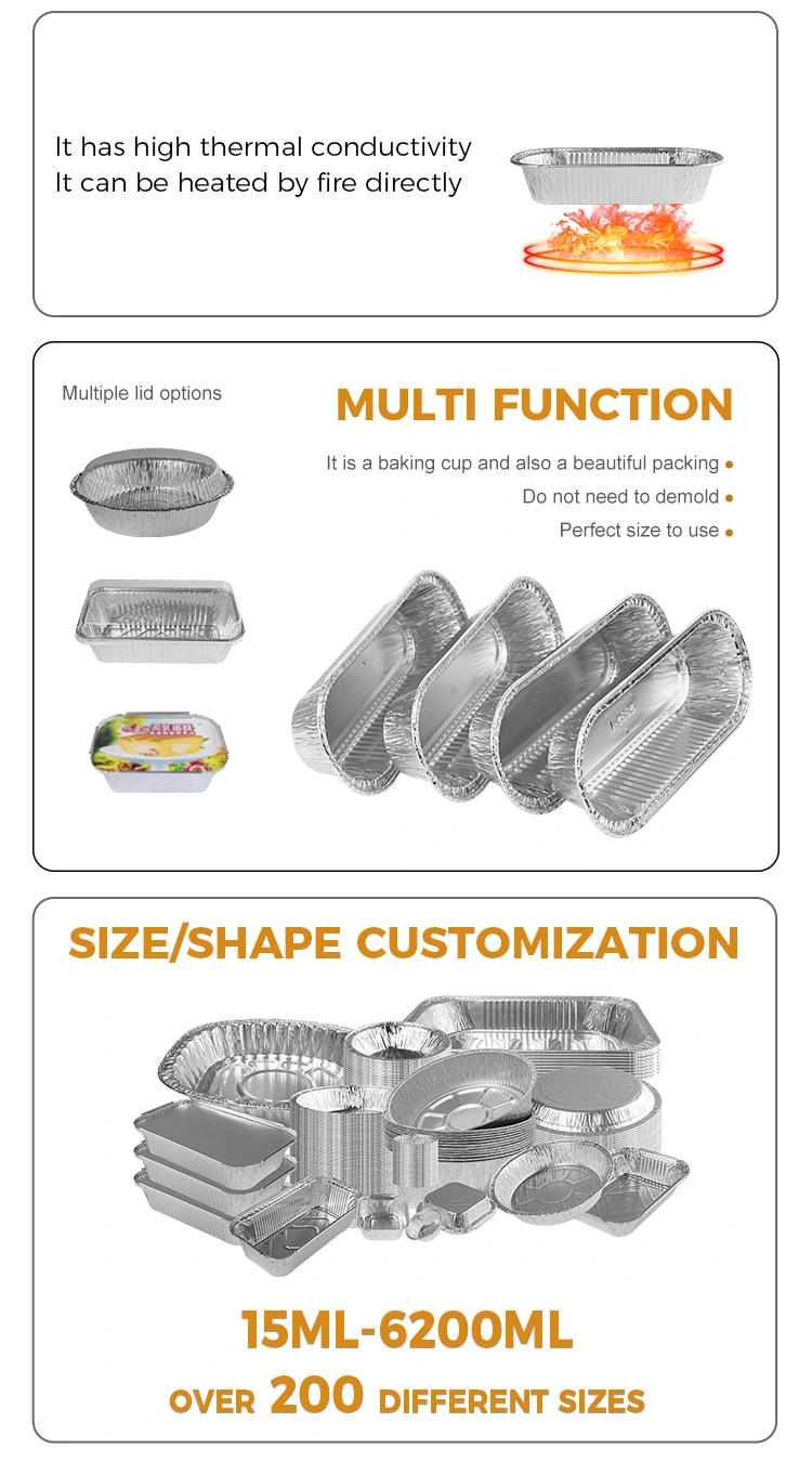 Yunchu Aluminium Supplierの楕円形のエアフライヤーベーキングシルバーフォイルコンテナは、ケータリング、ホームエアフライヤー、テイクアウト配達、ビュッフェソース、宴会などのさまざまな場所に適しています。また、卵、チョコレート、ビスケット、ビスケット、小さなケーキ、ソース、その他の食品にも適しています。食品であろうとソースとして使用するかどうかにかかわらず、この容器は幅広い食品および飲料業界で使用できます。さらに、焼き菓子と組み合わせることができ、小さなホイルカップは持ち運びが簡単であるだけでなく、料理に美しさを加えます。使用後に掃除する必要はなく、直接廃棄することができ、使用するのが非常に便利です。