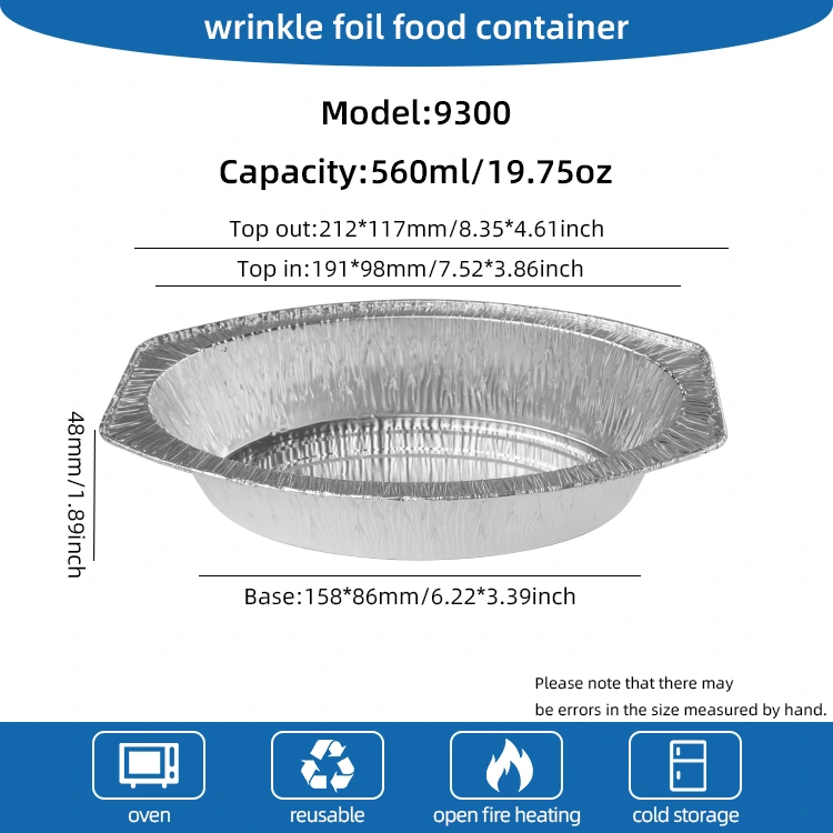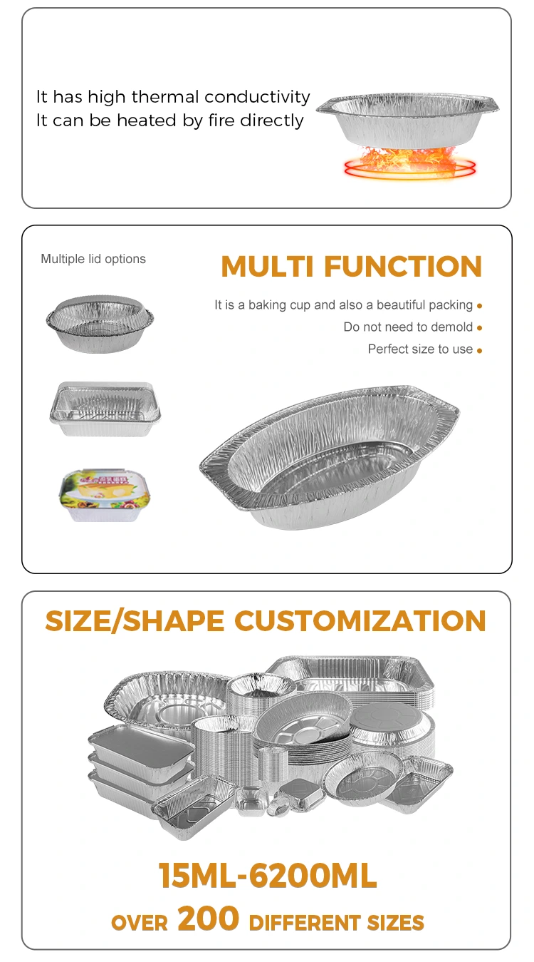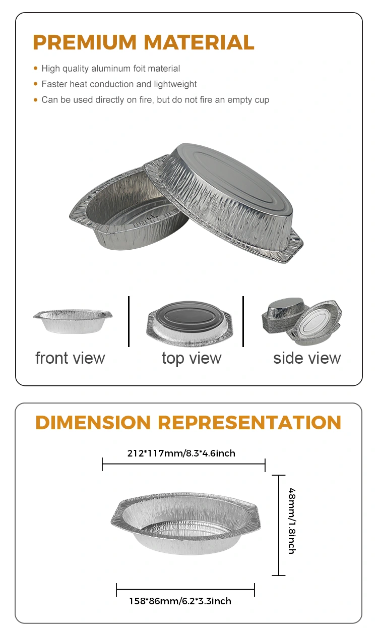 Yunchu Aluminum Foil Supplierは、家庭料理、ベーカリー、チェーンストア、冷蔵食品配達用の楕円形の焼きパンシルバーアルミホイルコンテナを提供しています。食品グレードのアルミホイル材料から作られたこの容器は、多くの銀色のベーキングボックスの中で際立っているユニークな楕円形の形状を備えています。この容器は、特にホットハンカチ、果物、パン、あらゆる種類のレトルト食品を保持するのに適しており、幅広い食器のニーズを満たすことができます。熱伝導率が良好であるため、高温を均等に放散し、食物が均等に加熱されることを保証できます。さらに、特定の負荷を含む能力と圧力抵抗があり、複数のスタックの場合でも安定性を維持し、変形を防ぎ、輸送中の使用に最適です。さまざまなシナリオやニーズにより適応するために、このコンテナは顧客の要件に応じてカスタマイズし、実用性を高めるために一致する蓋を提供することもできます。