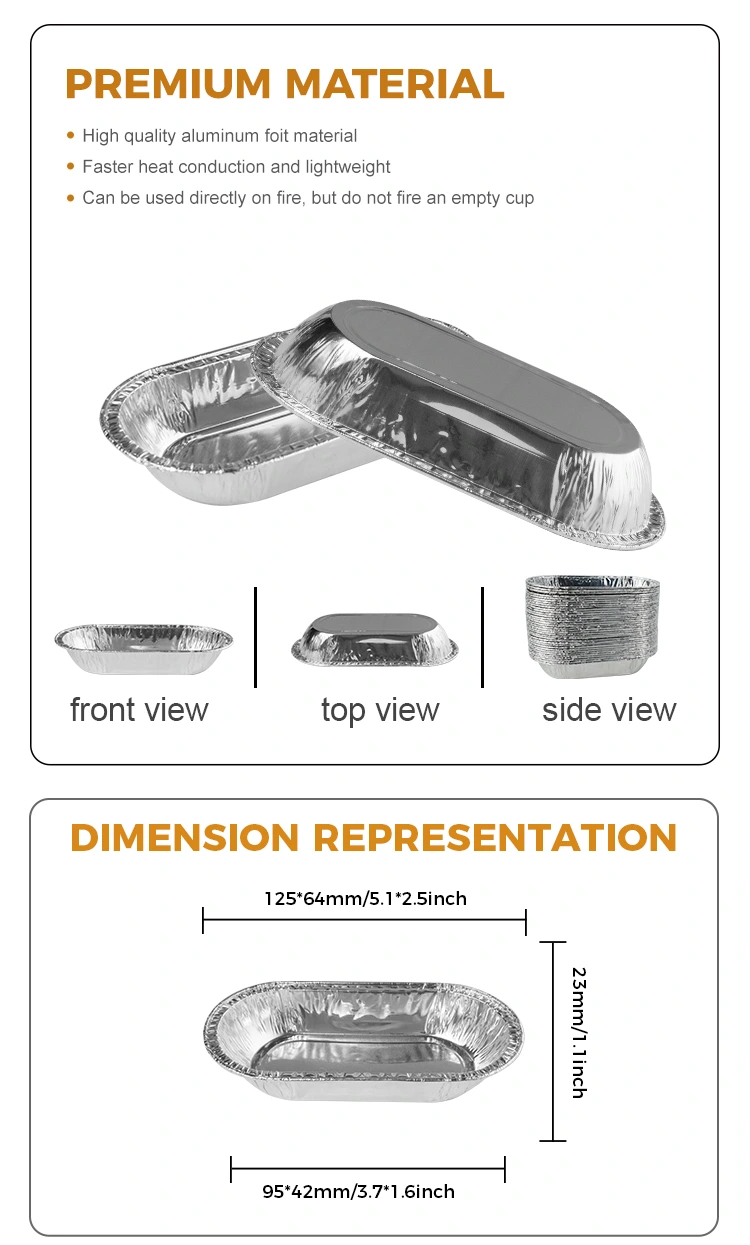 Yunchu Aluminium foil Oval Roast Silver Aluminum Aluminum Foil Food Containerは、長いパン、焼きクッキー、ケータリング、カキ、ソース、その他の食品用に設計された小さな容量のアルミホイル容器です。ソース、ディップ、小さな調味料、ベーキングサンプルのパッケージ化に適しているだけでなく、ソースの表示と分配にも特に適しています。容器は、鏡のような滑らかな壁で成形された食品グレードのアルミホイル材料で作られています。これは美しく実用的であり、パッケージの全体的なテクスチャーを大幅に向上させることができます。