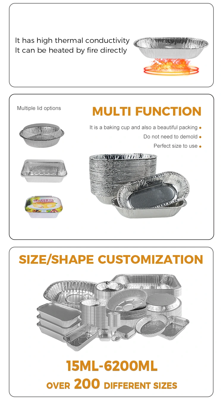 小規模で軽量なデザインにより、この楕円形のローストシルバーアルミホイルフードコンテナは、食品の使用や店舗での使用やカスタマイズに適した食品の運搬と保管に最適です。底部にある凹面と凸のテクスチャデザインは、摩擦を高め、熱を均等に分配し、局所的な過熱を回避するのに役立ちます。さらに、アルミホイルボックスは、圧縮抵抗と耐久性を改善するために厚くなっており、輸送中でも安定したままであり、変形は容易ではありません。