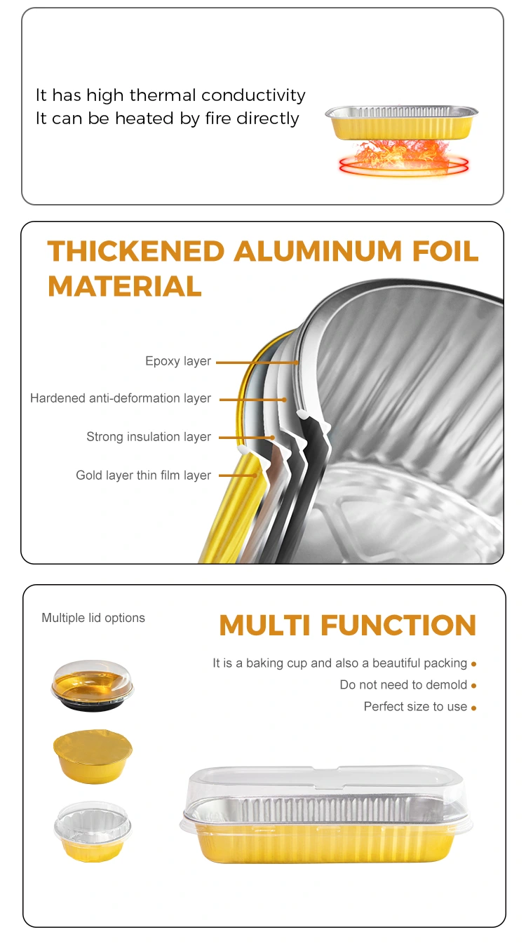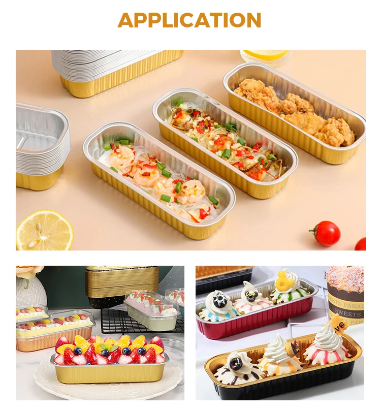 Yunchu Aluminium foil SuppliereRectangular Baking Cake smoothwallアルミホイルコンテナは、8011食品グレードのアルミホイル材料で作られており、蓋、アルミホイルの蓋、完全に透明なプラスチック蓋を備えた冷蔵庫に保管することを選択します。環境に優しい、底部の凹面と凸状の設計は、製品の安定性を高めるだけでなく、滑り止めにも役割を果たします。側面の補強材は製品の頑丈さを高め、耐久性を高め、さらに、この長方形の光壁のアルミニウム箔容器は、選択できるさまざまな色を提供し、好みに応じてカスタマイズできるようにします。