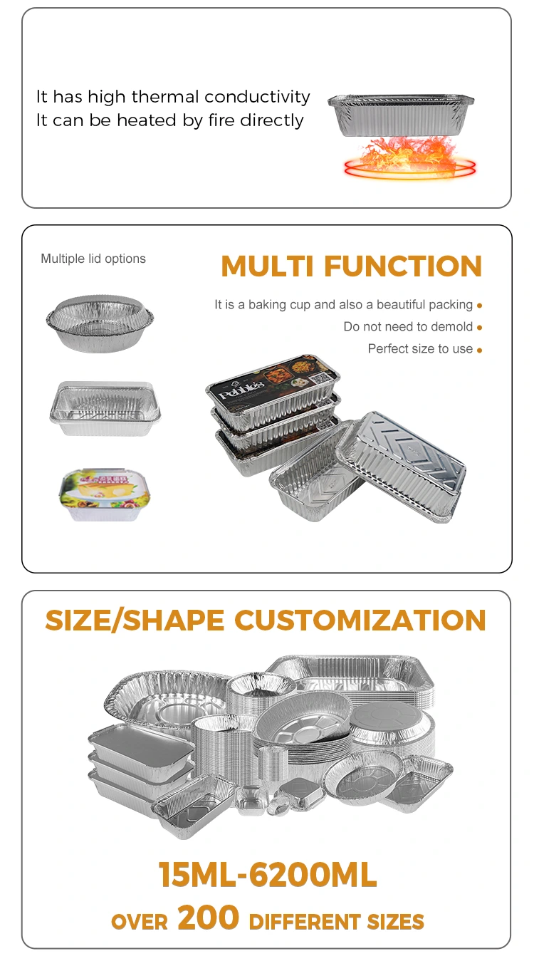 Yunchuアルミホイルサプライヤー、長方形のバーベキュー厚いシルバーアルミホイル容器は、バーベキュー、ホットポット、ベーキング、テイクアウトパッケージに適したヘルパーです。さまざまなサイズを箱で行うことができます。アプリケーション、熱と油抵抗、簡単なベーキング、屋外バーベキュー、一時的なボウルは火を恐れません。使用する場合、食べ物やスープを置く必要があり、水なしで乾燥しないでください。家庭用オーブンは清潔で便利です。