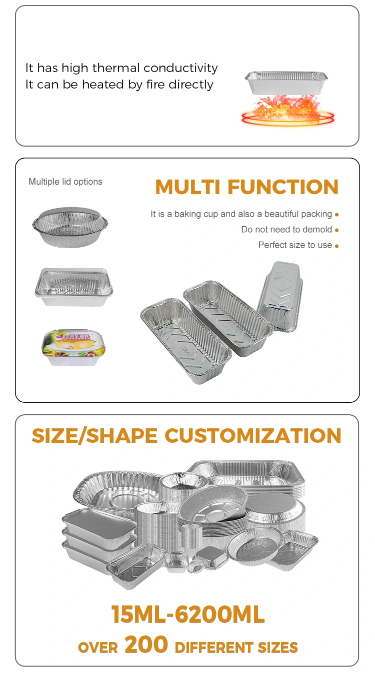 Yunchu Aluminium Foil Supplyが提供する長方形のパントレイベーキングシート銀アルミホイル容器は、高温の開いた炎に直面しても安定したままで、珍味が損傷しないことを保証する長期にわたる耐性のあるデザインを特徴としています。さらに、当社の容器は、食物が固執するのを防ぎながらスープが流出するのを効果的に防ぐために、盛り上がったセクションで慎重に設計されており、あらゆる一口を簡単に楽しむことができます。コンテナの洗練されたエッジは、使用中の削減のリスクを回避するために、美的に心地よく機能的であるように設計されています。内向きの折りたたみエッジのデザインはさらに親密であり、使用の安全性を確保しながら火傷を防ぎます。長方形のパントレイベーキングパンシルバーアルミホイル容器は、食品の安全基準を満たし、食品と直接接触することができます。さらに、当社の製品は使い捨てで、洗浄の問題を節約し、アルミホイルボックスもリサイクルしてグリーン消費を達成することができます。 Yunchu Aluminum Foilは、すべての生産プロセスを厳密に監視し、すべての製品が国の安全基準を満たすことを保証します。アルミニウム食品包装材料の国家安全証明書、ドイツのERP認定、EU SGS認定、ISO9001認定など、多くの国際認定を取得しました。