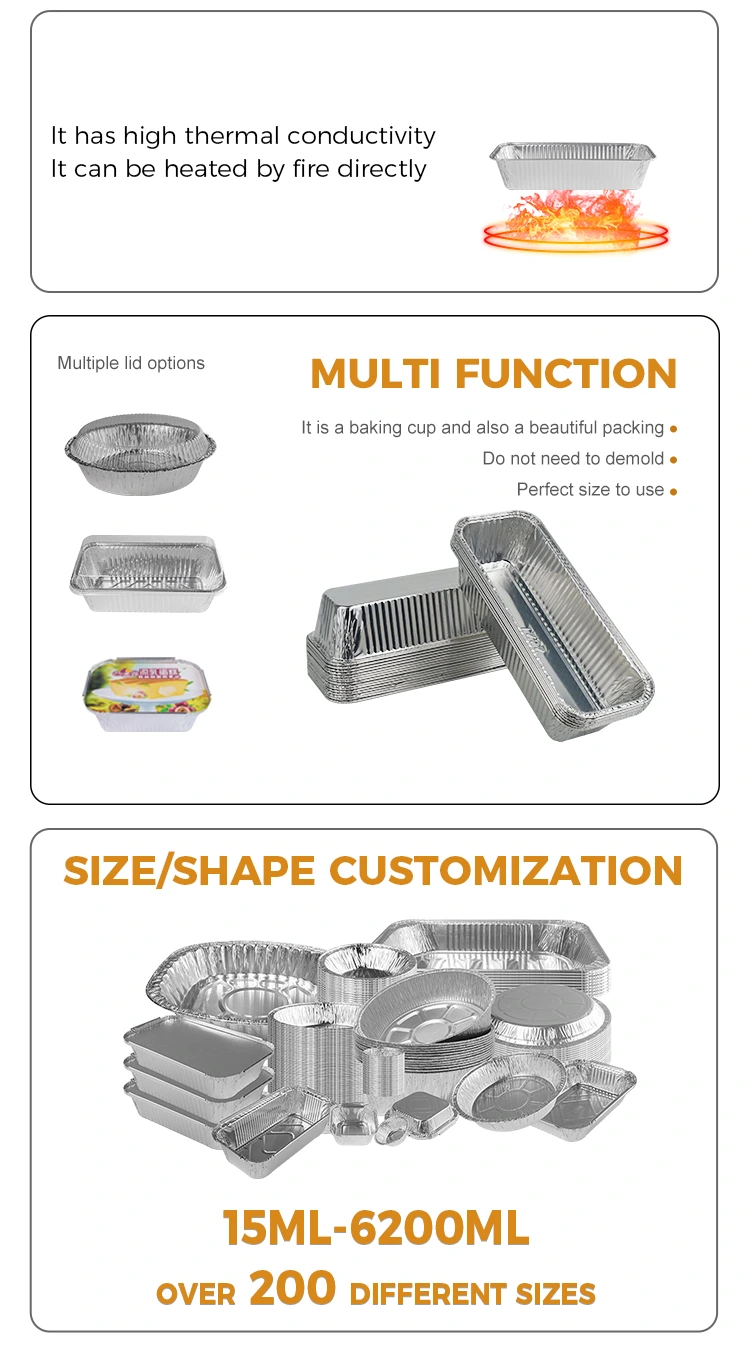 Yunchu Aluminum Supplyの長方形のパントレイシルバーアルミホイルコンテナは、さまざまな暖房方法をサポートするため、いつでも焼くのを楽しむことができ、熱保存効果は顕著です。アップグレードおよび濃厚設計、選択された高品質の環境に優しい材料、食品グレードのアルミホイル、ワンピース成形構造がより信頼性が高くなります。クリンプされたエッジのデザインは、熱を迅速かつ均等に行い、ベーキング中に底を燃やす可能性が低くなり、食物が断りやすくなります。この製品は、特にキャンプ、ベーカリー、バーベキューストール、テイクアウト配達、寿司レストランなどのさまざまな機会に適したバーベキューとベーキングの分野で広く使用されています。その設計は、ほとんどの家や店の実際的なニーズに適しています。