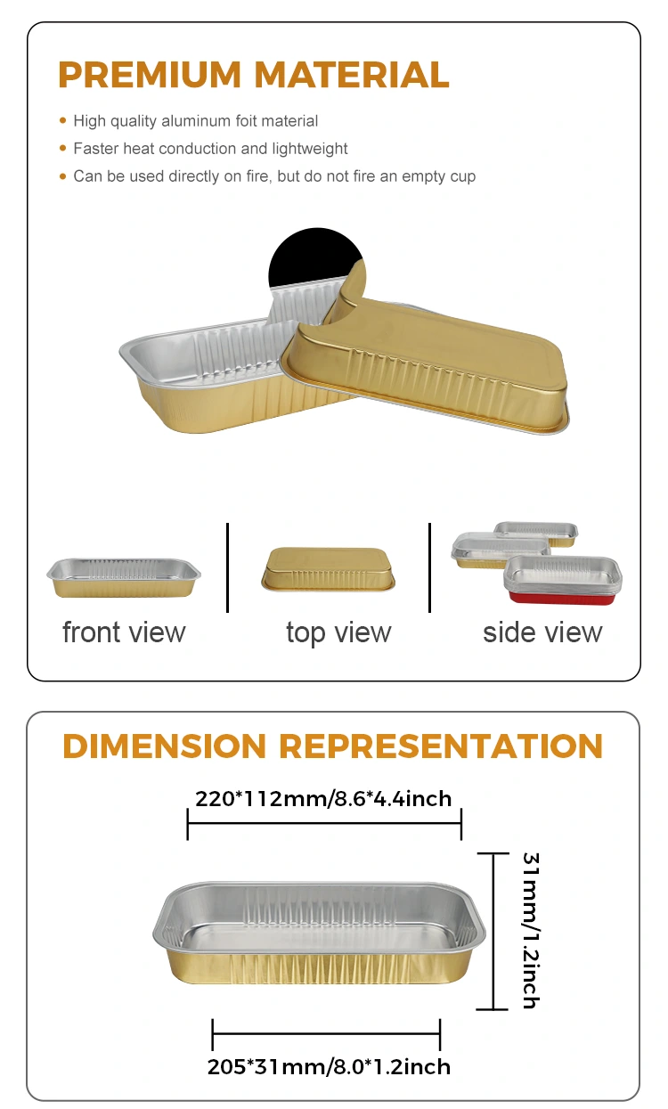 Yunchu アルミホイルは、8011-0 食品グレードの素材で作られた長方形の金色焼き付け Smoothwall アルミホイル容器のメーカーおよびサプライヤーです。バーベキュー屋台、ベーキング、家族での食事、キャンプ、テイクアウトなど、さまざまなシーンに適しています。このコンテナは、日常のベーキングやその他の食品のニーズを満たすだけでなく、さまざまな公共の場所でもこの製品の幅広いパフォーマンスを発揮できます。当社の厳格な製品選択により、この容器の密閉性は加盟店に広く認められ、テイクアウト業界でも漏れ防止が可能です。