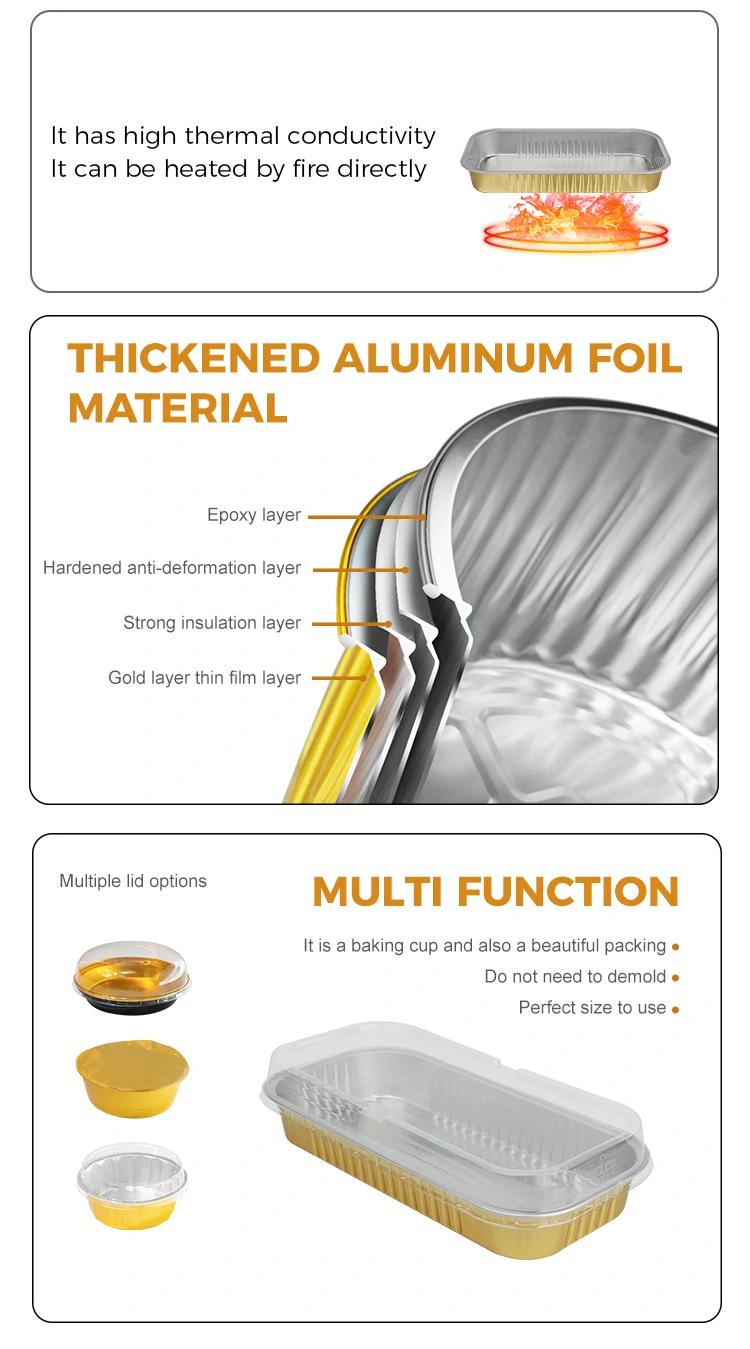 ケータリングテイクアウト:洋食軽食や焼き菓子などのデリバリーに最適です。金色の外観はブランドイメージを高め、アルミ箔素材は保温性にも一定の役割を果たします。