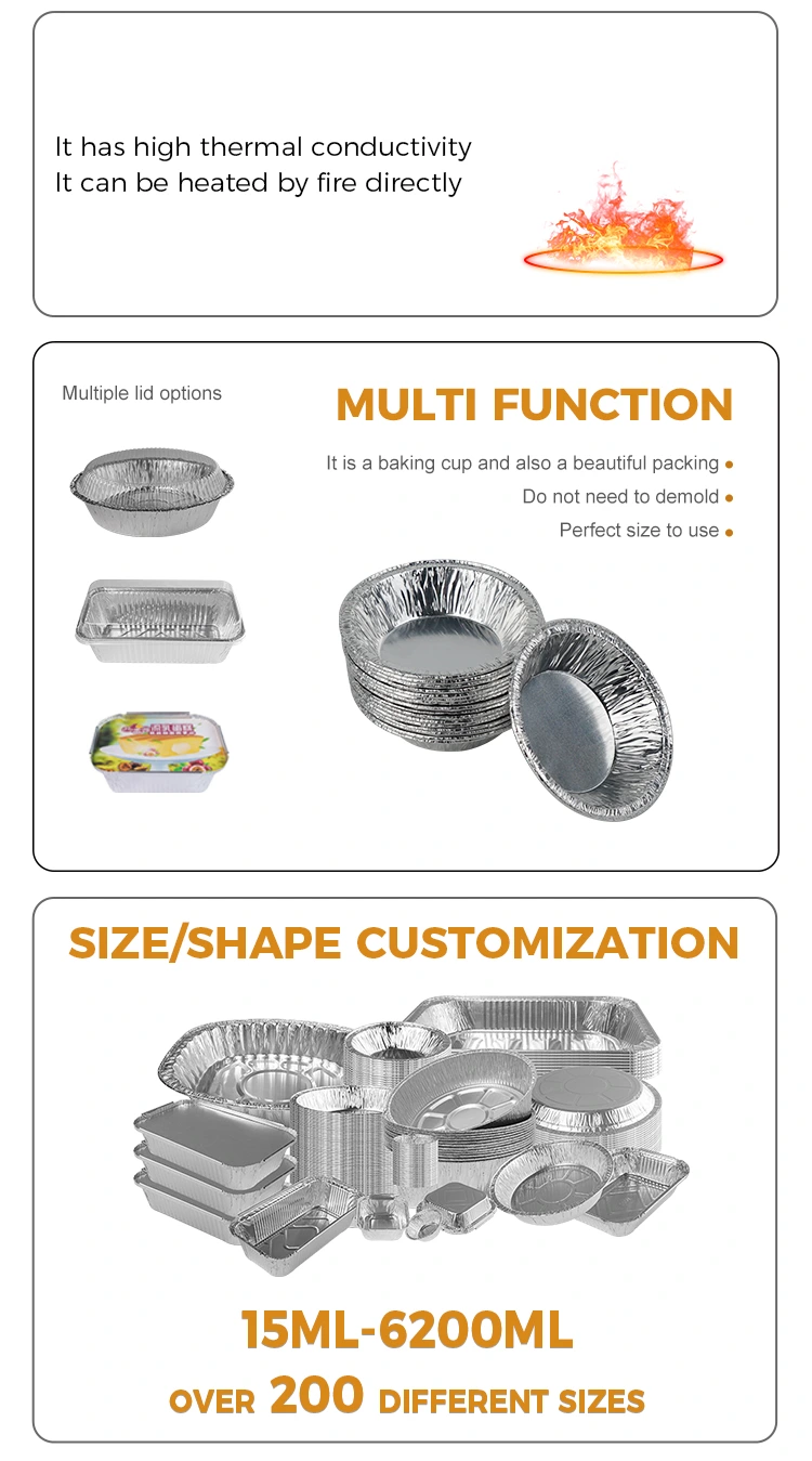 Yunchu Aluminum Foil Supplierの丸い卵タルトスナック用シルバーアルミホイル食品容器、均一な熱伝導、燃焼が簡単で、加熱さえ、美味しくて安全です。オイルプルーフとアンチフーリング、断ち切るのは簡単で、周囲のしわのある形状は簡単にアクセスでき、底面は丸く滑らかで、ワンクリックのクイックダメリング、使用後に失われ、掃除する必要はありません。複数の大容量のデザイン、1回限りの使用、骨の折れる、広く使用されている必要はありませんが、焼きたての卵タルト、ケーキ、卵黄のポテトチップス、ボウルケーキ、その他の珍味に使用できます。
