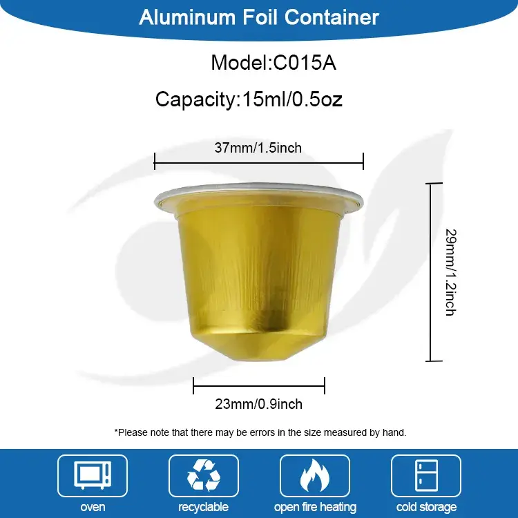 Yunchu Aluminum Supplier Silicone Seal空のコーヒーカプセルC015A次のサイズ:上部直径37 mm(約1.4インチ)、基部直径23 mm(約0.9インチ)、高さ29 mm(約1.1インチ)。このカプセルには、15 ml(約0.5オンス)の挽いたコーヒー、コーヒー液体が保持されます。すべてのネスプレッソマシン、パッケージ化されたエスプレッソ液に適しており、窒素すすぎで拡張することさえできます。さらに、ロゴと色をカスタマイズすることもでき、パターンはアルミホイルカバーに印刷でき、ロゴはコーヒーカプセルの底にスタンプすることもできます。