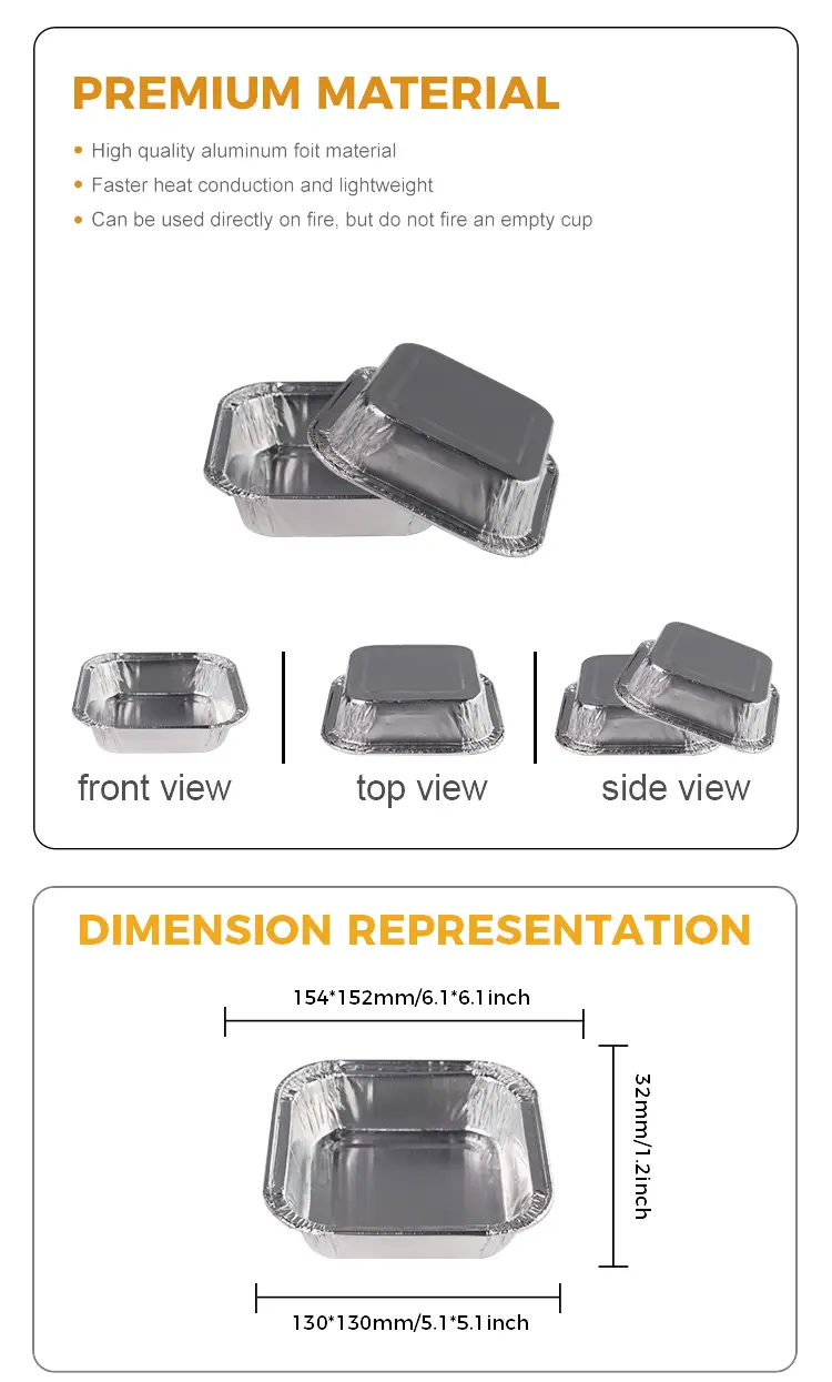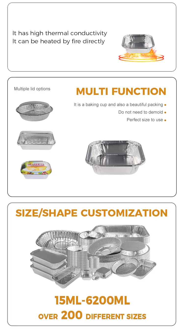 Yunchu Aluminum Supplier Square Cake Air Fryer Silver Aluminum Aluminum Aluminum Aluminum Aluminum foil Containerscanは、オーブンベーキング、エアフライヤー、オープンフレーム暖房、蒸し器蒸し器、その他の機器使用均一な加熱、均一な暖房など、さまざまなシーンでも広く使用されています。コンテナースカーは、小さなケーキ、自家製ヨーグルト、ゼリープディング、焼き卵、シーフード、その他の食品、底の凹面と凸のデザインに使用され、非滑りの役割を果たします。