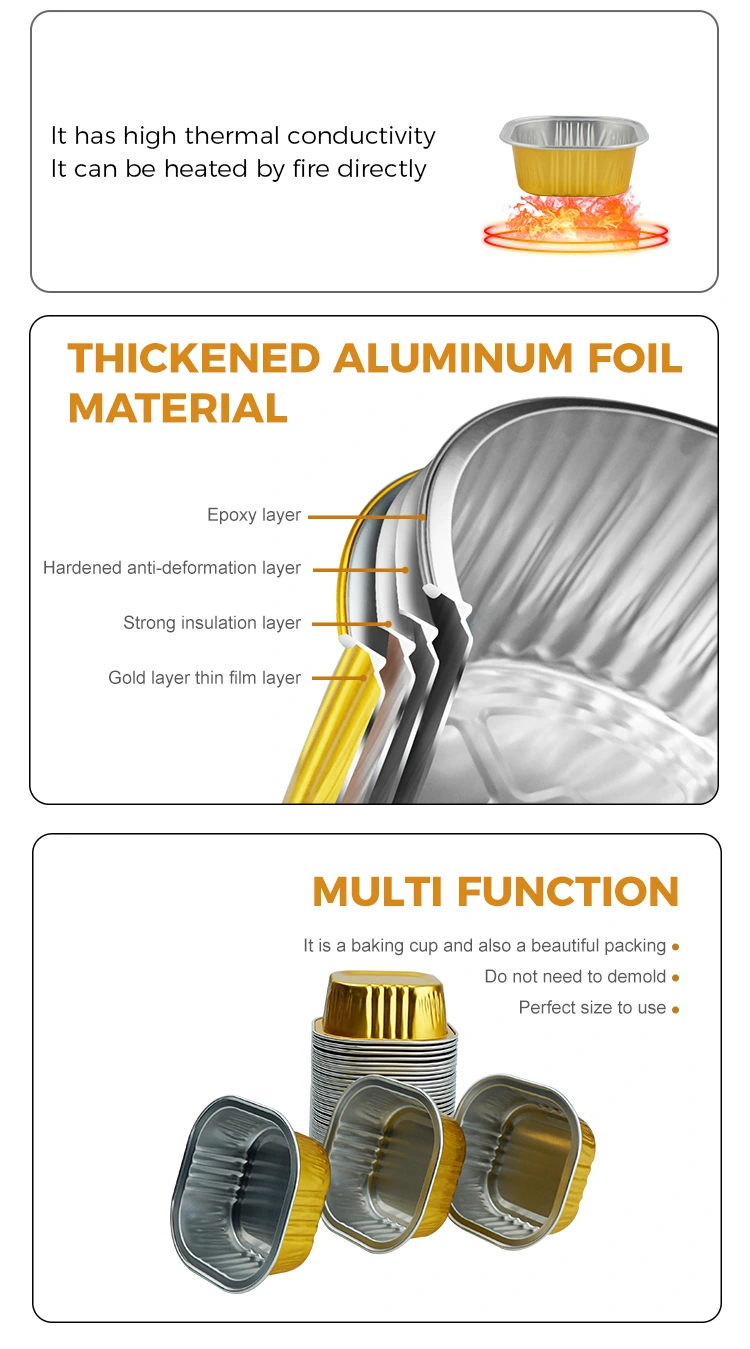 雲中アルミホイルメーカーのスクエアデザートベーキングカップSmoothwallアルミホイルコンテナは、エアフライヤー、ベーキング、ソースなどに使用できます。これらのベーキングカップは特別な強化リブデザインを採用しており、短いカップ本体の構造により、優れた摩擦特性があり、滑りにくく、取りやすく、手や口を傷つけません。カップケーキ、カスタード、ショートブレッド、パイ、シナモンロール、チーズケーキ、カスタード、プリンなど、さまざまなデザートを作るのに適しています。このリブ付き構造は追加のサポートを提供し、商業ベーカリー工場や大型スーパーマーケットでの使用に特に適しています。